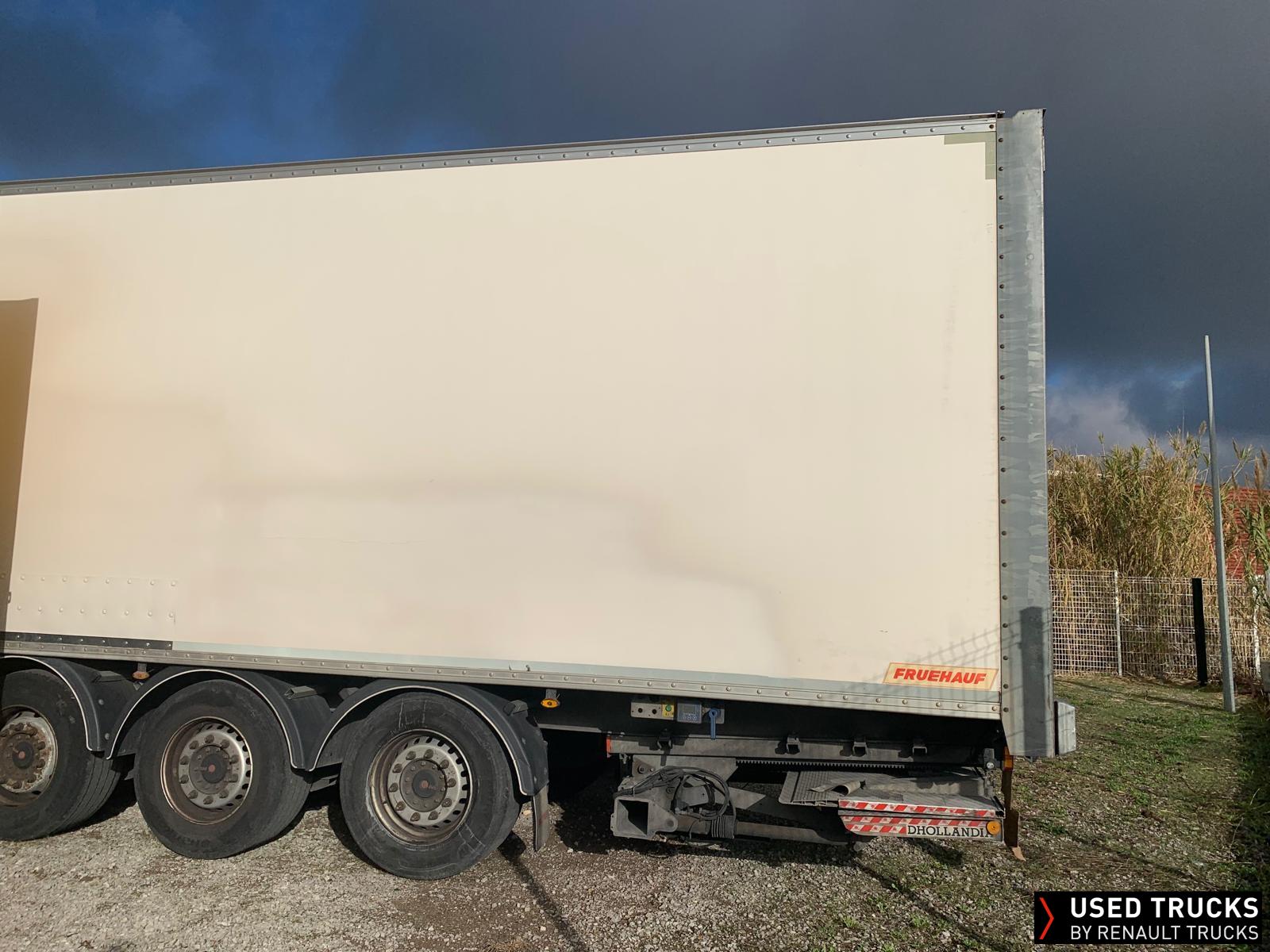 SEMI FRUEHAUF / 3 ESSIEUX / PREMIER ESSIEU RELEVABLE / SYSTEME DE GESTION HALDEX / FERMETURE ARRIERE PAR RIDEAU FIT / HAYON RETRACTABLE DHOLLANDIA 2,5 T / 2 RAILS D ARRIMAGE / PLANCHER BOIS OMEGA /